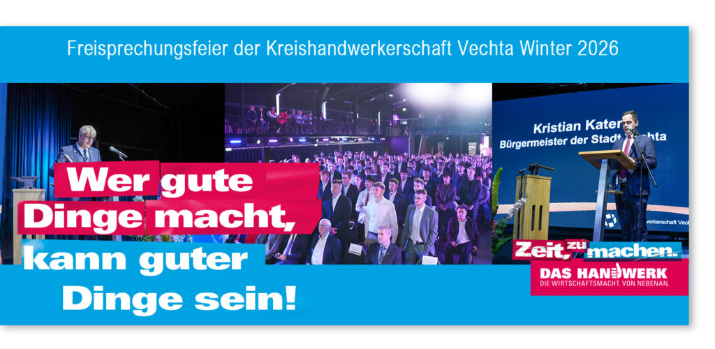 Die Kreishandwerkerschaft Vechta vertritt im Landkreis Vechta die Interessen des selbständigen Handwerks und führt die Geschäfte von 13 Handwerks-Innungen. Wir verstehen das Handwerk als die Wirtschaftsmacht von nebenan, bündeln Interessen und handeln mit Beratung, Bildung, Informationen und Dienstleistungen.